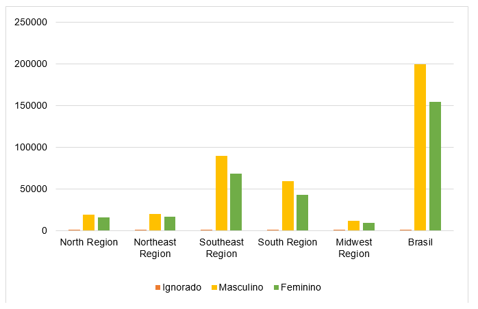 Regarding the confirmation of viral hepatitis cases by sex (Graph 3), the male population was the most affected, representing 56% of confirmed cases, with n=199318, while the female portion represented 44% of these, with n=154249 in Brazil, during the 10 years studied. In all regions, males prevailed. In the Southeast, men had a high number of confirmed cases, with n=89259, while the number of women was relatively lower, with n=68747. In the South, male cases numbered 58988, while female cases represented a comparatively lower number, with n=43165. In the Northeast, male cases numbered 19990, while female cases numbered 17151. In the North, the number of men was 18995 and the number of women was 15951. Finally, the Central-West region had a significantly lower number of confirmed male cases than the other regions, with n=12086, and the number of female cases was also low, with n=9235.