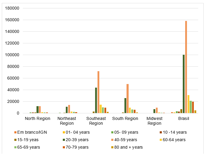 As for the regions (Graph 6), in the Southeast region the number of cases prevailed among the age group of 40-59 years, with n=72032, the second position was occupied by the range of individuals between 20-39 years, with n=43872, while the lowest number of cases occurred in those between 01-04 years, with n=260. In the South, confirmations predominated in patients between 40-59 years old, with n=50096, followed by cases in people between 20-39 years old, with n=26094 and the lowest prevalence was in the age group between 01-04 years old, with n=118. In the Northeast region, cases also predominated in those between 40-59 years old, with n=14,372, in second place there was a greater confirmation in cases between 20-39 years old, with n=11,221 and the lowest number was observed in the Blank/Ignored classification, with n=384.