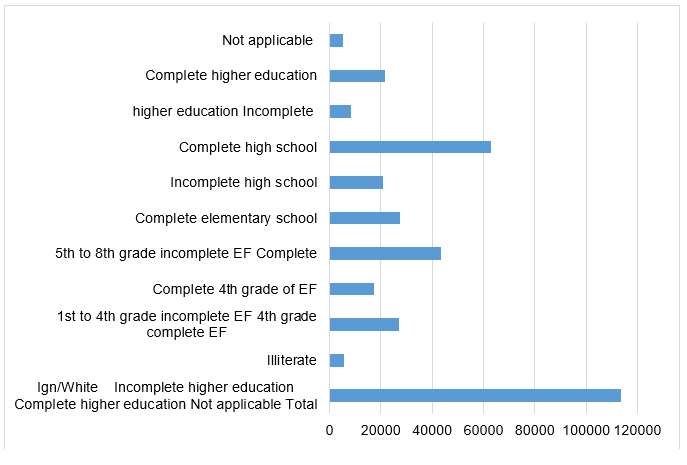Regarding the distribution of confirmed cases of viral hepatitis according to the education level of the Brazilian population (Graph 7), there was a significant predominance of cases in the Ignored/Blank classification (n=113740). The second most prevalent classification was the education level of individuals with Complete High School, with n=63042, followed by the education level of those with Incomplete 5th to 8th grade with Complete Elementary School, with n=43408 and in third place, the education level of Complete Elementary School, with n=27382. The smallest number of confirmed cases was observed in the Not Applied classification, with n=5174 and the education level of Illiterate individuals was the least prevalent, with n=5519, followed by the education level of Incomplete Higher Education, with n=8501.