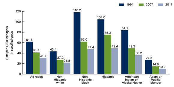 Teen pregnancy is a widespread concern in the United States. According to the Center for Disease Control, the current teen birth rate for the United States is roughly 34.3 births per 1000 women.1 This rate has been steadily decreasing since its ultimate peak in 1991 of 61.8 births per 1000 females aged 15-19. Although this rate is the lowest rate on record for the United States, our rate is still “three times the rate of Canada, four times the rate of France and Germany, and eight times the rate of Japan”.1,4 Teen pregnancy has been placed on the New York State Department of Health Prevention Agenda for 2013-2017 as one of the health improvement areas. Furthermore, the Community Health Assessment forums identified teen pregnancy as a prevalent concern in Onondaga County. There is a significant difference between the teen pregnancy rate and the teen birth rate. The birth rate is defined as the rate of babies being born to women aged 15-19 and is a concrete and reportable number. The rate of teen pregnancies is usually defined as the number of pregnancies per 1000 women between age 15-19 when the pregnancy ended and is essentially an estimate on how many teens have become pregnant. This estimate is calculated using abortion, birth and miscarriage rates for this age group. For the purposes of this policy report, the teen birth rates will be the primary statistics. There are several factors which make the teen pregnancy statistics in the United States so shocking. Important to note is the difference in teen birth rates between white, black, and Hispanic women. The teen birth rates for Hispanics and Non-Hispanic blacks are double the rate of Non-Hispanic whites.1 In 2011, the birth rate for Non-Hispanic white females aged 15-19 was roughly 24 per 1000. In the same year, the birth rates for Non-Hispanic black females and Hispanic females of the same age were approximately 49 per 1000 and 52 per 1000 respectively.1 It is troublesome to think that race and ethnicity could be such an important factor among these rates. Unfortunately, race and ethnicity are characteristics for which health disparities are ever present and according to the Guttmacher Institute, this gap between races is only getting larger. This is illustrated in the following graph Figure 1.While this graph shows that the teen birth rates are declining, it is important to remember that the United States also has the highest abortion rate of any industrialized nation.1,5 Furthermore, New York State has the highest abortion rate of any state in the U.S. with 37 abortions per 1000 females aged 15-19 in 2008.1,6,7 These higher abortion rates lead to a lower birth rate among teens, even though the original pregnancy rate was much higher.