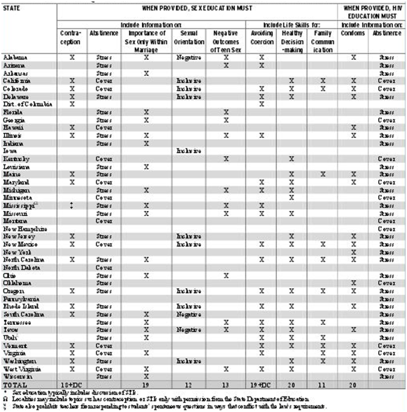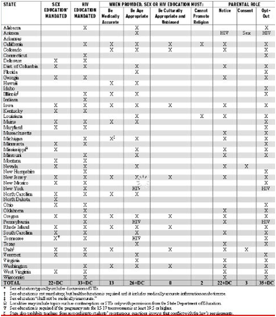 “27 states and the District of Columbia mandate that, when provided, sex or HIV education programs meet certain general requirements. 13 states require that the instruction be medically accurate. 26 states and the District of Columbia require that the information be appropriate for the students’ age. 8 states require that the program must provide instruction that is appropriate for a student’s cultural background and not be biased against any race, sex, or ethnicity. 2 states prohibit the sexual education programs from promoting religion”.6