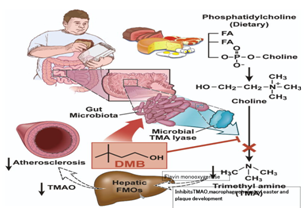 The formation of TMAO in our body takes place following nutrient ingestion, via gut microbes which form TMA, and then host hepatic flavin monooxygenases (FMOs) catalyze the conversion of TMA into TMAO.12 Recent studies highlight the importance of both TMAO and host hepatic FMO3, the primary FMO responsible for TMAO production, as important regulators in host lipid and sterol metabolism, as well as in development of atherosclerosis12,76 Figure 1. A structural analogue of choline, 3,3-demethyl-1-butanol (DMB) is an inhibitor of microbial TMA production (a choline TMA lyase inhibitor). It also inhibits choline diet dependent enhancement in TMAO, endogenous macrophage foam cell formation, and in development of atherosclerosis.