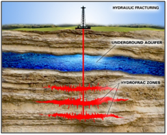 Although hydraulic fracking can potentially provide economic growth, job creation and clean energy, there is another side to the fracking industry. When extracting natural gas, methane and carbon dioxide are released into the environment. Both are greenhouse gases that contribute to global climate change. Releasing methane also creates the potential for explosions.6 Running a hydraulic fracking procedure requires an extensive portion of water. Each well needs millions of gallons of water to operate (between 2 and 5million). This can create stress on community fresh water sources. The chemicals in the fracking fluid can contaminate drinking water. The pipes that travel deep into the earth pass the ground water table, if leakage occurs the fresh water source is in danger. One study reported that in wells near a fracking site the drink water contained 17 times more methane than in average wells.6