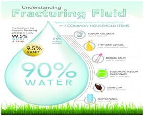 Currently, companies are not legally mandated to release the recipe of their fracking recipe, creating quite a challenge when assessing the risks associated with the concoction. The chemical components vary depending on if the fluid needs to be gel-like, foam-like or slick. Although, the chemical portion of the mixture accounts for the least volume, approximately 0.5-1 percent, around 40,000 gallons are needed per fracking job. Each company has a unique combination of 5 to 10 ingredients that can be protected under the federal trade secret exemption. However, several studies have been conducted to analyze the fluid and identify 600 potential chemicals. The list includes formaldehyde, acids, benzene, ethyl benzene, toluene, polyacrylamide, sodium chloride, guar gum, glutaraldehyde and Polyacrylamide. Acids are present in order to commence the fissure process and to dissolve carbonate minerals and debris such as cement. Polyacrylamide reduces the abrasions between the liquid and pipe. Guar Gum is needed to thicken the water and enable the suspension of the frac sand. Sodium chloride helps break down the gel polymers. Glutaraldehyde is needed to kill corrosive bacteria in the liquid. The hydrocarbons, ethyl benzene, toluene, benzene (a known human carcinogen) and xylene are very hazardous chemicals to work with due to their potential for water contamination and adverse health effects.5