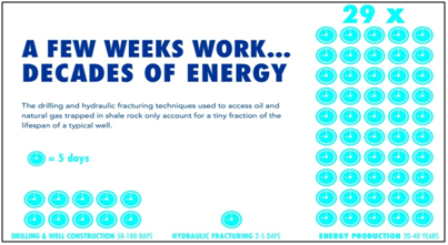The movement towards natural gas has a positive effect on the environment and climate change, the reduction in carbon dioxide emissions. On average, coal emits two times the amount of carbon as natural gas does per unit electricity generated. In addition, the emissions of other greenhouse gases such as sulfur dioxide have lowered due to the reduction of productivity from coal fired power plants. The benefits of fracking are realized for decades after the initial site construction. The timeframe of initial construction lasts between 50 and 100days while the actual fracking procedure lasts only 2 to 5days. Several months of work equate to 20 to 40years of natural gas production from each well.7