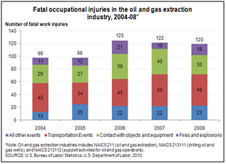 Working in the natural gas extraction business carries heavy physical risks. Workers are in danger of falling, injuring their heads and getting hurt by machinery. According to the Bureau of Labor and Statistics, the oil and gas industry has a fatality rate of 27.5 per 100,000 workers. This rate is 7 times the US average occupational fatality rate. The most common causes of injury in this industry come from transportation incidents, contact with object and equipment and fires and explosions. The median for days away from work is 30 while the average US rate is 7. This is attributed to the nature of the injuries experienced in the fracking industry. Many injuries involve fractures where significant time is needed for healing.13