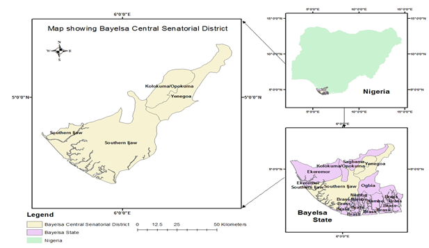 The study was conducted in the oil producing communities in Central Senatorial District of Bayelsa State. It is one of the three senatorial districts, after East and West Senatorial Districts. Of the eight local government areas that make up Bayelsa State, Central Senatorial District has three (Yenegoa, Southern Ijaw and Kolokuma- Opokuma). East Senatorial District has two L.G.As (Sagbama and Ekeremor), while the West Senatorial District has three L.G.As (Ogbia, Nembe and Brass). The Central Senatorial district, which is the area of the present study lies between latitudes 4o 321’ and 5o 331’ North of equator and longitudes 7o251’ and 8o251’ East of the Greenwich Meridian. The Central Senatorial district has a total landmass of 27,241 square kilometers. It is bounded by Rivers State on the North; East Senatorial district on the East, West Senatorial district on the West, and the Atlantic Ocean on the south. It has a population of 750,049 people based on the 2006 National Population Census Report.14,15 Oil drilling operations are extensively carried out in Southern Ijaw Local Government area by Shell, Sephron and Agip Companies. The communities affected by oil operations in Southern Ijaw include Oporoma, Agiama, Agiama-gbene, Onyoma, Peremabiri, Olugbobiri, Olugbo-uboro, Ogboinbiri, Oki-ama, Koliama 1 and 11, Kemebiama, Azuzuama, Ondowari, Koro-korosei, Ikebiri, Tebidaba and Igbematoru. In Yenegoa Local Government Area, the communities where oil operations are carried out are Bisani, Okordia, Zarama, Ogboloma, Okolobiri, Agudama –Ekpetiama, Tombia, Akaibiri and Polo-aku. In Kolokuma-Opokuma local Government area, the communities affected by oil operations are Opokuma, Sabagreia, Sampou and Kaiama. Within the Central Senatorial District, there are hospitals (Federal Medical Centre, Yenegoa; General hospital, Oporoma in Southern Ijaw L.G.A.); Primary Health Care Centre in Oporoma Local Government Area; and Health Centre in Opokuma. These offer health care services to patients of water related health problems(Figure 1).