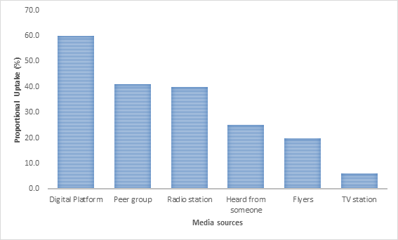 The uptake of Anthrax messages through various media sources were; Digital platform 60.1%, peer group 41%, Radio station 39.9% (Figure 2).