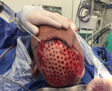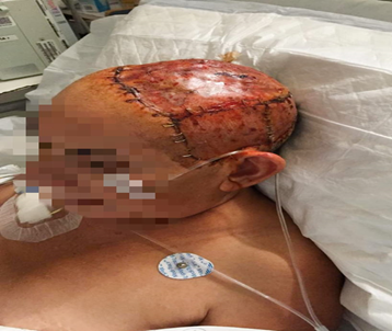 The following clinical case is presented, which corresponds to a 58-year-old female patient from the state of Puebla, resident of Ixtapaluca Estado de México, who suffered an avulsion of the scalp while working with an agricultural machine. (husker). She suffered an accident in the workplace, with craniocephalic trauma generating detachment of the hairy skin, and is transferred to the Hospital Regional Emilio Sánchez Piedras Tlaxcala, where cranial trephines were performed as a reconstructive surgical treatment method to generate granulation tissue in the biparietal area with bleeding and moderate pulsatile activity, as well as loss of 50% of the pinna, skin traction was performed to avoid retraction and loss of 80% of the scalp skin, transfer is made to the Hospital Regional de Alta Especialidad de Ixtapaluca (HRAEI) for assessment and continuation of medical-surgical care (Figure 1).