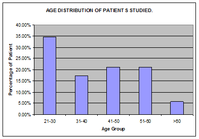 The age distribution of the patients studied was from 21to 66years maximum number of patient (34.6%) was in age group 21-30years (Graphs 1-7).