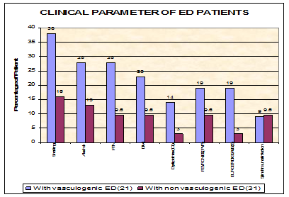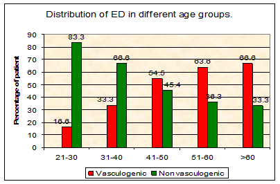 Graph 1 The vasculogenic cause of ED increases with age, percentage distribution in different age group patient was 21-30(16.6%), 31-40(33.3%), 41-50(54.5%), 51-60(63.6%) and >60 years (6.6%).