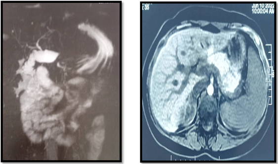 Our 30-year-old patient presented with nausea and abdominal pain in the right hypochondrium. Physical examination showed no mucocutaneous jaundice or pallor with slight tenderness of the right hypochondrium. Laboratory tests, including liver function tests, showed a slight elevation of YGT and PAL. Abdominal ultrasonography showed a sclero-atrophic gallbladder, with fine intra- and extra-hepatic bile ducts and a thin duct of Wirsung. The ultrasound appearance and cholestasis justified a Bili MRI (Figure 1) concluding to a homogeneous liver with regular contours and no detectable focal lesions ,the vesicular loge was free in relation to agenesis, the bile ducts were not dilated, the pancreas was normal in appearance with a fine Wirsung.