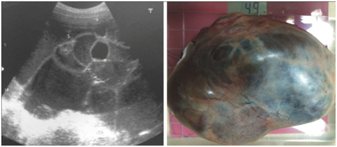 A 15year old female patient referred to pediatric surgery outpatient clinic with the complaints of abdominal bloating and abdominal pain. Routine tests, abdominal ultrasonography, and CT revealed a cystic mass extending from pelvic area to xiphoid at the size of 20x30cm, thought to be mesenteric and ovarian origin. The patient underwent operation and was monitorized with electrocardiogram (ECG), oxygen saturation (SpO2), end tidal capnography and non-invasive blood pressure and peripheric vessel cannulation was carried out with 22G catheter. Following adequate preoxygenation, in anesthesia induction, 2mg/kg propofol, 2mcg/kg fentanyl, (Talinat, Vem, Istanbul) 0.6mg/kg rocuronium (Esmeron, Schering-Plough, Istanbul) were administered. Patient was intubated with inner diameter 7.0 no tube and was ventilated at low pressure in case giant mass exert pressure on large vessels. In order to prevent hypotension which may develop following mass excision, 10ml/kg fluid resuscitation was performed. Urine output and blood loss was monitorized. A mass at the weight of 4900g mass was removed during operation. (Figure 1) Patient was hemodynamically stable during operation and was extubated without any problems.