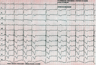 Figure 1 12-lead electrocardiogram with sinus rhythm, electrical axis 160°, HR 59 bpm, PR segments 160 msec, QRS 120 msec, QT 456 msec, rsR morphology in V1 to V3, negative T wave of asymmetric branches from V1 to V6, incomplete right bundle branch block.