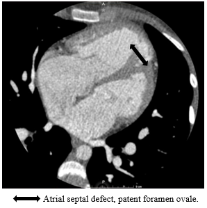 Upon regaining alertness, the patient comments that a study was carried out that has not been assessed by the treating physician: Contrasted cardiac tomography on 05/19/21 with a report of: atrial septal defect, patent foramen ovale 9 x 7 mm, interatrial septum defect 28x 25x 29 mm, pulmonary artery with a dilated appearance and a caliber of 44 mm, coronary arteries with little value due to movement and lack of dilation, secondary increase in lung vascularity (Figure 3).