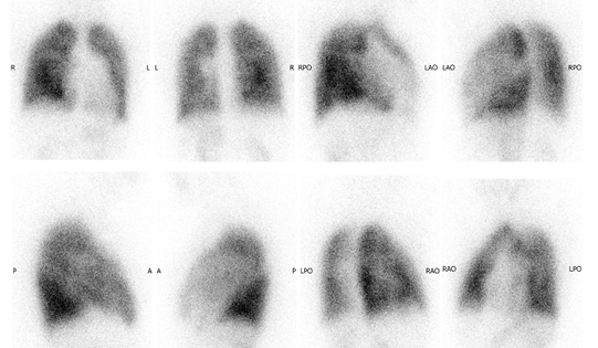 Figure 4 Pulmonary scintigraphy, with a preserved base-vertex perfusion relationship, thus ruling out the diagnosis of pulmonary thromboembolism.