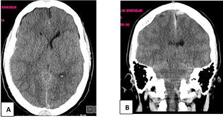 In the Intensive Care Unit, he remained under sedation with propofol calculated at 1-2 mg/kg/hr, requiring the use of norepinephrine-type vasoactive amines at a dose of 0.3 mcg/kg/minute, buprenorphine-type opioid analgesics, 3% hypertronic solutions secondary to intracranial hypertension, acyclovir at a dose of 2.1 g every 24 hours and Ceftriaxone at a dose of 4 g every 24 hours (for 8 days) and levetiracetam-type anticonvulsant 2 g every 24 hours. An extubation protocol was carried out, however, it was not tolerated by the patient, and it was necessary to continue under assisted mechanical ventilation. Upon admission to the service, the following laboratories were reported: Leukocytes 4.10 103/µl, Neutrophils 6.78 103/µl, Lymphocytes 0.83 103/µl, Hemoglobin 12.3 g/dL, Hematocrit 36.5%, platelets 179 103/µl, PT 13.7 sec, TTP 34.3 sec, INR 1.13, glucose 136 mg/dL, Creatinine 0.95 mg/dL, Urea 47 mg/dL, DHL 306 U/L, Na 148 mmol/L, K 3.9 mmol/L, Cl 113 mmol/L, Ca 7.70 mg/dl, Phosphorus 2.7 mg/dl, PCR 4 mg/dl.