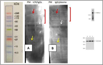 Presence of N-methyl-D-aspartate (NMDA) receptor in CSF < plasma, low presence of GAD 65/67 in CSF < plasma and negative for GABAb and AMPA.