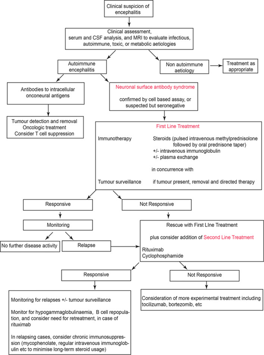 The growing group of autoimmune encephalitis requires clinical and experimental investigation into the underlying pathophysiological mechanisms and associated tumors and prompt immunotherapy and prognostic factors. Antibodies against neuronal surface structures are usually directly pathogenic. The prognosis depends mainly on the type of CA (for example, NMDA, GABA receptors or VGKC complex). Encephalitis is caused by, among other things, CNS tumors and infections. In the more insidious clinical courses, which are sometimes more like neurodegenerative presentations than florid encephalitis syndromes, they often lead to late diagnosis and therefore delayed initiation of immunotherapy. Although tumors, prion diseases, and metabolic disorders are often found in the differential diagnosis, a pragmatic trial of immunotherapy may only be absolutely contraindicated in the setting of some infections. However, observational data show that corticosteroids may be beneficial in some forms of herpes simplex virus (HSV) encephalitis, suggesting that this may not be a universal contraindication. Second-line treatments are generally given when first-line therapies do not produce clear benefit, or when disease is known to be severe or recurrent, and typically include rituximab, cyclophosphamide followed by monthly cycles, or other alternatives such as azathioprine, tocilizumab, mycophenolate among others.
