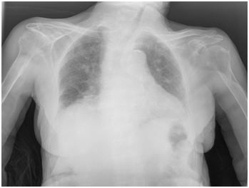 The blood tests showed an INR of 1.09 (normal laboratory value 0.90-1.22) and a hemoglobin of 11.2 gr / dl (12gr / dl-16 gr / dl) with the rest of the laboratory parameters normals. A chest x-ray was performed that no reveal significant findings (Figure 2).Inmmediately, a cervical CT scan was made that showed a parenchymal laceration of the right thyroid lobe with hematoma evolved in the ipsilateral laterocervical region and in the superior mediastinum without evidence of compatible images with aneurysms in the arterial territories studied (Figure 3).