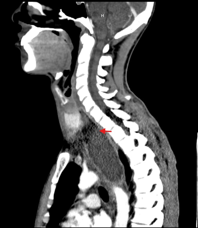 Figure 1 CT: Sagittal view showing an abscess extending from the left thyroid space to the superior mediastinum.