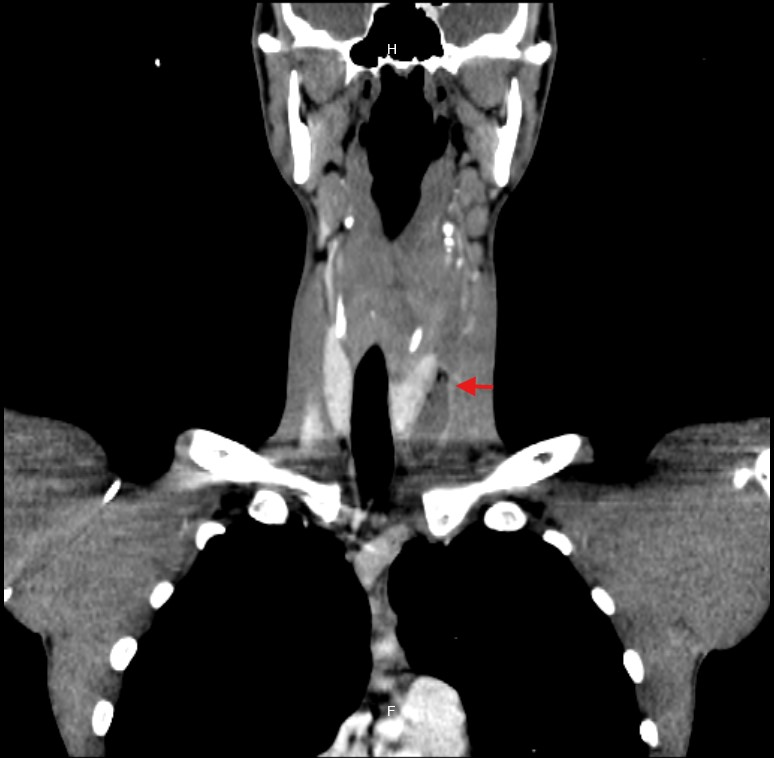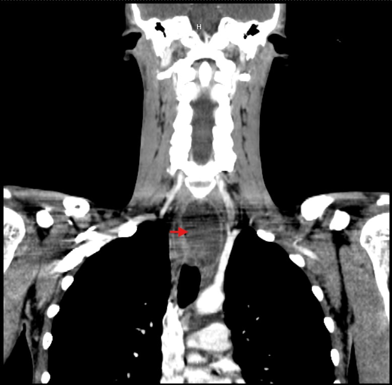 Due to the unclear etiology of the symptoms, combined with unremarkable initial studies and the subsequent development of dyspnea, a CT scan of the neck and thorax was performed. This revealed a large collection centered in the mediastinum, dissecting tissue planes and extending below the carina, reaching into the neck up to the left thyroid lobe. Gas was observed both within the collection and around the thyroid gland and mediastinum, with the esophagus displaced to the right by the mass effect of the abscess (Figure 1-5).
