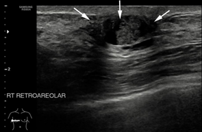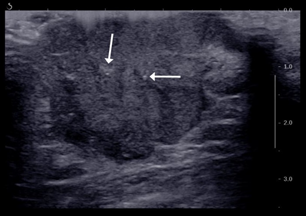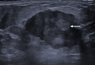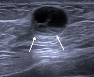Figure 10 Ultrasound image showing a well-defined rounded, anechoic lesion with posterior enhancement at right breast. Presence of solid component (white arrows) noted within the cyst.