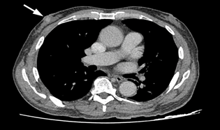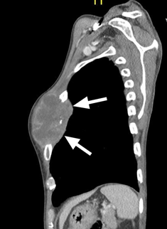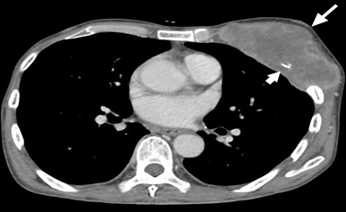 A 59 years old gentleman who was an ex-chronic smoker (40 pack-years) was referred to our centre for a huge left breast mass. On further history, the patient claimed that the left breast swelling has been there for the past one year and he never seek any medical treatment. While in the ward patient developed generalized tonic-clonic seizure (GTC) for six episodes, aborted by intravenous Phenytoin. An urgent brain computed tomography (CT) was performed and a left frontal intra-axial space-occupying lesion was found. Clinically, the left breast swelling was irregular in shape, measuring about (18x5) cm, hard, non-tender and fixed to the underlying structures. There were left axillary lymph nodes palpable. A TRU-CUT biopsy of the left breast mass was performed and histopathology results came out as Invasive breast carcinoma of no special type (NST).Contrasted tomography (CECT) of the thorax was performed for the staging purpose and was reported as the presence of lobulated heterogeneously enhanced mass occupying the whole left breast measuring (11.1x4.7x9.2) cm with an erosion of the left anterior end of second to fourth lateral surfaces of the ribs. Also, there were multiple enhancing axillary lymph nodes bilaterally, at the pre-tracheal, para-tracheal, sub-carina and the presence of lung nodule in the superior segment. There was metastatic lesion seen on the left adrenal gland measuring (3.7x2.9x3.5) cm as well. The patient was staged as T4N1M1. No surgery was done as patient deteriorated and succumbed to death due to Pulmonary Embolism (PE) on day eleventh of admission (Figure 3–5).