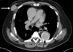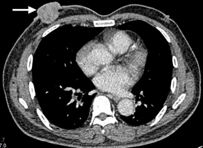 A 64 years old gentleman with an underlying Stanford Type B dissecting aneurysm post endovascular intervention (EVAR) was referred to our breast clinic for a right breast lump. According to the patient, the lump has been there for the past three months and it is gradually growing bigger .The right breast lump was associated with pain and he was dependent on regular pain killer. Otherwise, the patient denies any history of trauma, discharge per nipple or a contralateral breast lump. There was no positive family history of breast cancer as well. Upon clinical examination, there was a round swelling at nine o’clock position, 1 cm away from the right nipple, measuring about (3x3) cm in size. The mass was firm, mobile and non-tender. There was no nipple discharge or Peau de’orange skin changes seen. Right breast ultrasound showed the presence of a well-defined lobulated heterogeneous mass at 9 o’clock, 2 cm from the nipple. It measures (1.9x3.2x2.7) cm with posterior enhancement and microlobulation. There was internal vascularity with the resistive index of 0.81(BIRADS 4).Otherwise no dilated ducts are seen and no enlarged right axillary lymph nodes either. The left breast showed no focal lesion. An ultrasound-guided biopsy was performed on the same day and the histopathology result revealed the lesion as Invasive breast carcinoma, no otherwise specified (NOS).The patient was counselled to undergo a computed tomography (CT) scan as the ultrasound findings were suspicious. The CT scan was reported as right breast invasive ductal carcinoma with evidence of local infiltration and no distant metastasis (T4N0M0). The patient was offered a right mastectomy but unfortunately patient defaulted our follow-up (Figure 8, 9).