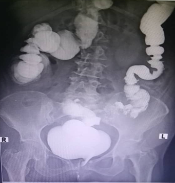 61-year-old white female patient with previous health history (hysterectomy for uterine fibroid 02-03-2000). Who comes to our service for presenting pain in the lower abdomen, pneumaturia and fecaluria. On physical examination, a 5x7 cm tumor in the hypogastrium of hard consistency, with irregular edges, non-mobile and painful is palpable. Abdominal ultrasound is performed which reports a heterogeneous image of 7x6.5 cm supravesical in intimate relationship with the sigmoid colon, a contrasted abdominal computed tomography is requested (Figure 1), which reports intravesical hydroaereal level. A cystoscopy was performed, which confirmed our diagnostic suspicion of a colovesical fistula, and a biopsy punch was taken, which reported well-differentiated adenocarcinoma. A colon is performed by enema with water-soluble contrast (Figure 2), observing the colovesical communication, gorge image (sigmoid colon neoplasia), and addition images (sigmoid colon diverticulosis). With all the above elements, the patient is announced under the diagnosis of colovesical fistula, performing sigmoidectomy and partial cystectomy with immediate colorectal anastomosis and cystorrhaphy complemented with a catheter cystotomy (bladder carving). The patient evolves favorably and is discharged on the tenth day. The biopsy reports a well-differentiated mucoproducer adenocarcinoma.