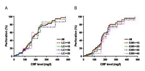 Conclusion: Perforation of appendicitis can be predicted from the CRP level and the duration of abdominal pain. These findings might influence the choice between conservative or surgical treatment of appendicitis, and could provide guidance in the early start of antibiotics.