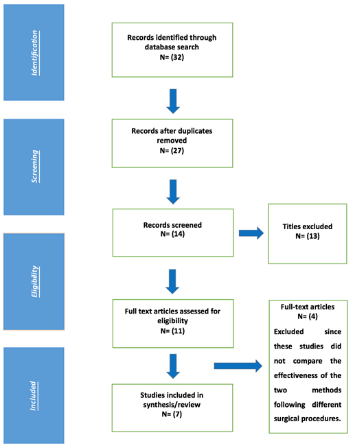 Five of the chosen studies were RCTs, and two were cohort studies that met the selection criteria (Table 1). RCTs that did not obtain approval from ethical committee and patients’ informed consent were excluded. Rees emphasised that ethics is a major consideration in all research stages, as it protects researchers and participants from any potential harm. Additionally, any duplicated published articles were excluded.27