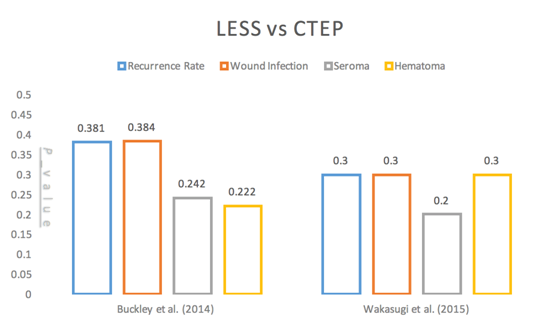 Firstly, the results of the current studies showed that there are no significant differences between LESS and CTEP in terms of complications such as recurrence, wound infection, seroma, and hematoma at six-month follow-up. For instance, Wijerathne et al.14 results did not show a significant association between recurrence rate and wound infection (p=>0.05), seroma (p=0.38), or hematoma (p=0.242). In Buckley et al.46 the complication rate between the two arms did not differ significantly (p=0.84). Additionally, Wakasugi et al.14 found similar results, with no significant difference in the complications in terms of recurrence rate (p=0.3), wound infection (p=0.3), seroma (p=0.2), and hematoma (p=0.3).