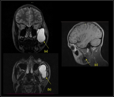 Figure 2 (a-b) T2-weighted coronal and axial (repetition time msec/echo time msec: 5,500/112). (c) T1-weighted (24/80) sagittal sequence; showing images compatible with space occupant lesion with interior walls. Yellow arrows point to a lesion located between the maxillary sinus and zygomatic arch bone left, from the zygomatic region until the buccal region, over to masseter and pterygoids muscles and below to the temporal muscle.