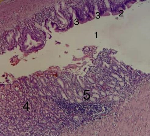 Macroscopic examination reported a 2,5x1,5x1 cm, opened nodular, dark brown, soft tissue structure, cystic without content. Microscopic examination showed a cystic cavity lined mostly by mucous secretory gastrointestinal epithelium and other areas by stratified squamous epithelium. The cystic wall was composed of fibrous connective tissue and contains abundant gastric cells. Its deepest portion exhibited a smooth muscle layer (Figure 3).