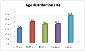 Age distribution: In our study, 27.1% patients were above the age of 65 years and 14.6 % patients less than 35 years. Mean age was 53.4+14.3 years Figure 4.