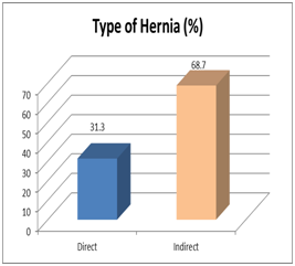 Type of hernia: In our study 31.3% patients were operated for direct hernia and 68.7% patients were operated for indirect hernia Figure 5.