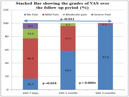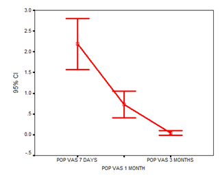Postoperative pain: On comparing the mean VAS score on 7th postoperative day(2.18± 2.12) and 1 month (0.72±1.10) significant difference in mean vas score was present and p value was (p =0.0001), and gradually when we followed our patients in 3rdmonth mean VAS score has decrease to 0.04± 0.20 . On comparing the mean VAS score on 7 th and 3 rd post operative month p value was (p= 0.008), thus gradually statistically significant difference in mean VAS score was present in 3 month follow up (Table 2).