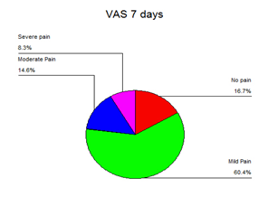 Similarly on comparing the mean VAS score at the end of 1stmonth (0.72+- 1.10) and 3 rd month (0.04± 0.20) statistically significant difference was present. (p = 0.0001) (Table 2 & Figure 6-9). Postoperatively when we compare the grades of pain at 7thday, 1month, and 3rdmonth, the proportion of patients with pain was found to decrease (Figure 6). 4(8.3%) patients were having severe pain in groin region after 7thpostoperative day and managed by giving analgesic. Most of the patients 46 (95.8%) returned to normal activity, at the end of 1 month.18 (37.5 %) patients complained of mild pain and 2(4.2%) patients complained of moderate pain when they did more than normal activity after one month and pain was localized to port site. No patient developed pain after 3 months (Table 3 & Figure 10).