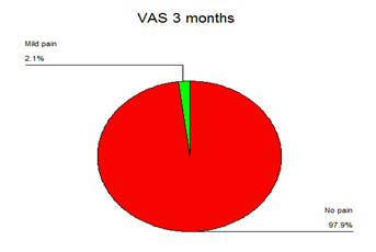 Result: A total of 48patients were included in the study, and all repaired with 3D mesh. On comparing the grades of VAS score on follow- up of three month , 47patients ( 97.9%) were reported no pain and one patient (2.1%) was reported having mild pain (p=0.011) (Figure 1). All the patients were discharged on 1stpostoperative day and 46patients (95.8%) were returned to normal activity without pain in 1 month. In our study at the end of 3months mean VAS score (n=48) was .0417±.20194. No patient reported swelling and recurrence on 3month follow-up.