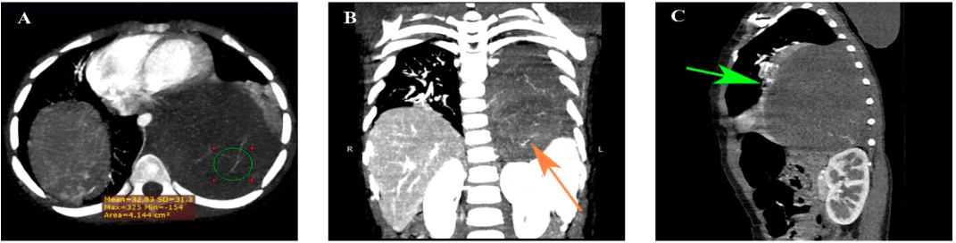Figure 2 CT Scan of the chest with intravenous contrast media. (A) Axial: In the left lung field there is a homogeneous solid mass of well-defined smooth contours, with heterogeneous enhancement, without contrast medium has an attenuation of 40 HU, there are several visible vessels inside the lesion that appear to depend on intercostal and aortic branches, after the application of contrast medium increases between 10 and 20 HU of attenuation. (B) Coronal: It is located between vertebral levels T3- T11, measuring 8.1cm x 11.2cm x 8.2 cm (width x height x depth) with a volume of approximately 387cc, caudally causes descent of the left diaphragm inferiorly displacing the left spleen, adrenal gland and kidney. (C) Sagittal The mediastinal mass forms acute angles with the parietal pleura and displaces anteriorly the middle mediastinal structures. In addition, it causes left lower lobar atelectasis (green arrow). The mass contacts the descending aorta, esophagus and pericardium, but maintains preserved cleavage planes.