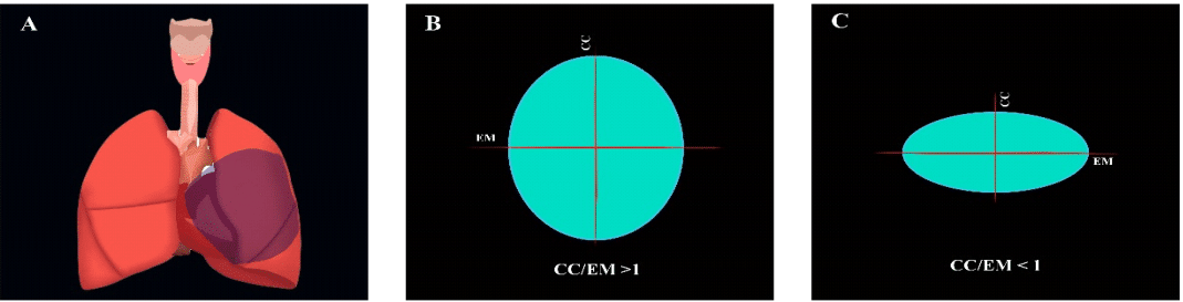 Figure 3 Assessment of mediastinal masses. (A) Uncharacterized mediastinal lesion. (B) Craniocaudal coefficient (CC) in relation to the major axis (MA) >1 associated with benign lesions. (C) Craniocaudal coefficient (CC) in relation to the major axis (MA) > 1 associated with neoplasms.