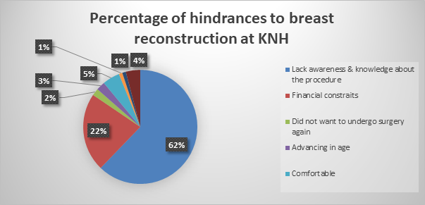 Patients that did not receive a breast reconstruction reported the following hindrances: lack of awareness, financial constraints, being comfortable with their body image, advancing age, they did not want to undergo surgery again, further therapy, unmarried. The frequencies of the above we demonstrated in Figure 1.