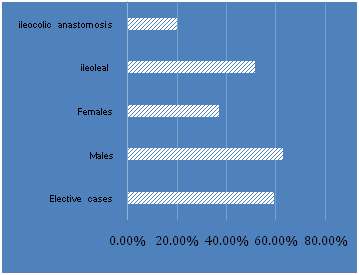 All elective cases were included for reversal of ileostomy. Out of 35 elective cases, 18/35(51.4%) were operated for ileoleal and 7/35(20%) were operated for ileocolic anastomosis, as shown in (Figure 1).