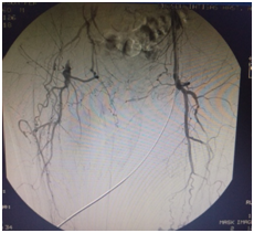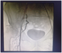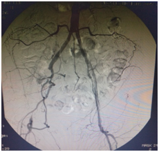 A 58-year-old male patient was admitted to our clinic with a complaint of pain in both legs with intermittent claudication. He had a medical history of 25-years of smoking, diabetes mellitus and hypertension. On physical examination, anterior tibial artery (ATA) and posterior tibial artery (PTA) pulses were non-palpable on both sides. The patient had Fontaine stage 2 b symptoms according to the classification of peripheral arterial diseases. Digital subtraction angiography (DSA) revealed that both superficial femoral arteries (SFA), external iliac arteries (EIA) and common iliac arteries (CIA) were totally occluded (Figure 1-3).