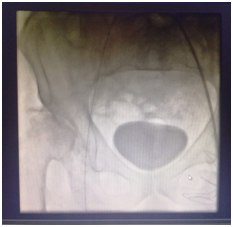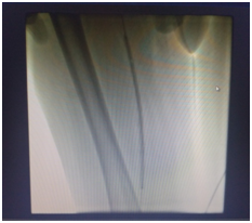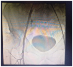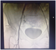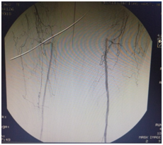 Since the patient's claudication was more pronounced in the right leg, a decision to proceed with interventional treatment of this leg was made. The procedure was performed in the hybrid operation room under local anaethesia. The Seldinger technique was used for imaging and sheath was placed into the left femoral artery guided retrogradely to the right side Figure 4. The total occlusion of the right iliac artery, CFA and the SFA were passed by the guidewire and DEB was performed (Figure 4-7).