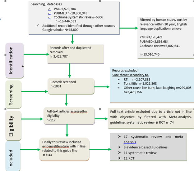 After setting eligibility criteria for the evidence to be used and choosing the best methodological approach, an extensive search for evidence was carried out. Different evidence was searched by using the keyword to access current and reliable information on risk stratification, prevention and management of post-operative sore throat from May 2023 to October 2023.A literature search was conducted in different data bases. The articles were searched using the Boolean operators. Randomized controlled trials (RCT), guidelines, systematic reviews, and meta-analyses (Table 1).