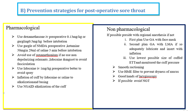 Methods: Evidence was searched by using the keyword to access current and reliable information on risk stratification, prevention, and management of postoperative sore throat from May 2023 to October 2023.A literature search was conducted in different databases. The articles were searched using the Boolean operators. Randomized controlled trials (RCT), guidelines, systematic reviews, and meta-analyses.