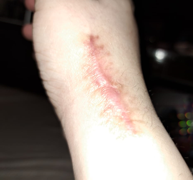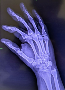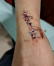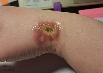 A 39-year-old Asian female develops a blister, at the site of a cannula inserted for hydration with normal saline. The lady had a recent history of dehydration due to an outdoor summer lunch on a hot day. Her past medical history includes Ulcerative Colitis, Psoriasis, and Psoriatic arthritis for the last decade. The large blister ruptured, exposing the underlying dermis. She was prescribed saline washes with application of Fusidic acid ointment, twice daily (Figure 1). The lesion responded initially, but after two weeks, the edges of the lesion became hard, indurated and crusted and the underlying dermis showed a darkened pigmentation with pain on palpation of the snuff box underneath. A preliminary clinical diagnosis of superficial venous thrombosis was proposed; but refuted when the coagulation studies and INR appeared normal. A trial of an ointment containing hydrocortisone, Neomycin, Bacitracin, and Polymyxin for local application, and oral Vibramycin failed to show any improvement in closing the wound, or receding the central black pigmentation, and the patient continued to complain of wrist pain. An X-ray revealed local bone lucency under the lesion (Figure 2). A surgical consult was requested that excavated the necrotic tissue and closed the edges neatly by eleven stiches in local anesthesia administered to the patient (Figure 3 & 4).