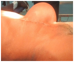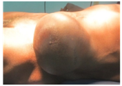 We report the case of a 75-year-old man, who was received in consultation for an abdominal painless mass of the left flank, gradually increasing in volume. His medical history related a midline xypho-pubic laparotomy in 1970 for an unspecified cause of peritonitis. The physical examination indicated a good general condition, colored mucous membranes, and a painless and irreducible mass of soft consistency measuring 15x13 cm in the left flank, Figure 1. We noted a midline xypho-pubic laparotomy scar. The rest of the physical examination showed no specificities. The blood count Biology showed a 5000/mmᵌ white blood cell count, a 11.9g/dl hemoglobin level and a 327000/mmᵌ platelet count. The creatinine serum was 10mg/l and the urea 0.20 g/l. The computed tomography (CT) showed a parietal liquid collection of the left flank measuring 15x13 cm with a thickened and regular wall containing a dense formation of lamellar appearance foretelling of a foreign body herniated to the lateral wall Figure 2. A general anesthesia was performed on the patient for the surgical exploration. The surgical exploration by incision at the level of the mass revealed a seroma shell containing 21 of shady liquid and a Delbet blade measuring 20 cm long in an extra-peritoneal position Figure 3. We carried out a complete excision of the hull taking out the Delbet blade without any peritoneal/bloodshed, and a myorraphy. The postoperative management was simple. The patient was allowed to resume home four days after surgery (Figure 1–4).